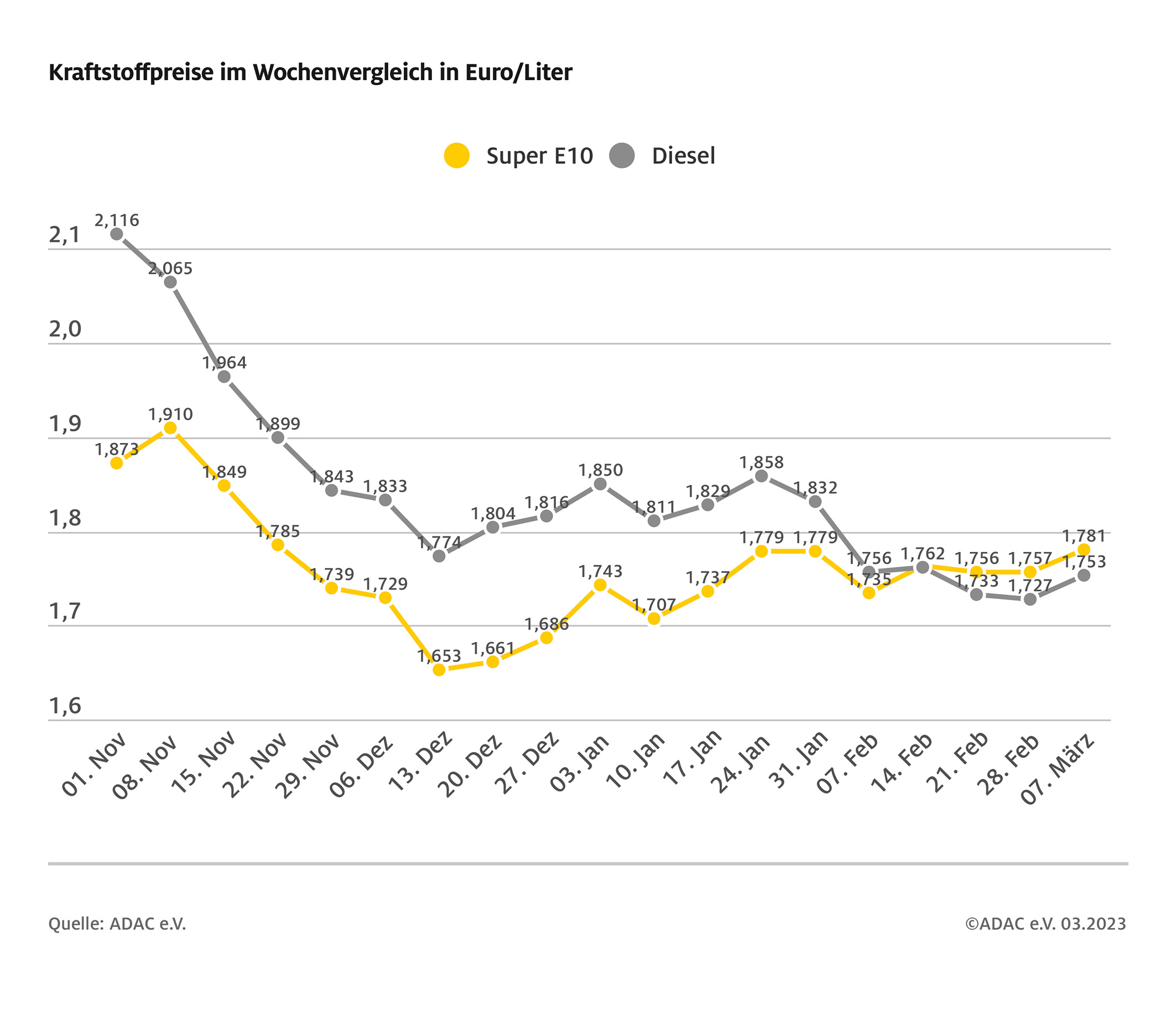 München (ots) – Am Kraftstoffmarkt kann derzeit von Entspannung keine Rede sein – im Gegenteil. Wie die aktuelle ADAC Auswertung der Kraftstoffpreise in Deutschland zeigt, sind die Preise für beide Kraftstoffsorten gestiegen, für Diesel stärker als für Benzin. Danach kostet ein Liter Super E10 im bundesweiten Mittel 1,781 Euro, das sind 2,4 Cent mehr als vor Wochenfrist. Ein Liter Diesel verteuerte sich um 2,6 Cent auf 1,753 Euro.