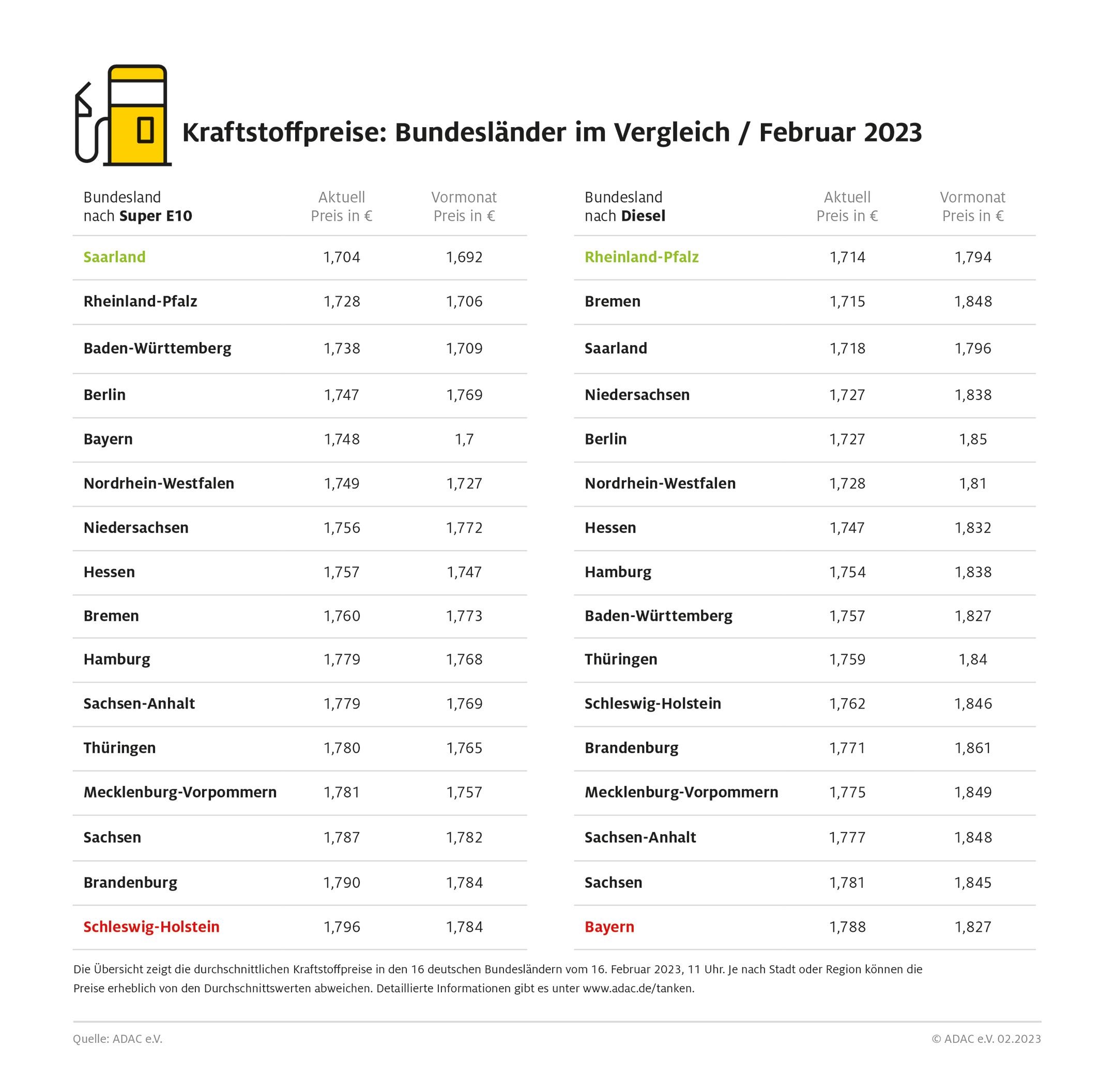 Super E10 ist, wie schon im Vormonatsvergleich im Saarland mit 1,704 Euro je Liter am preiswertesten. Mit deutlichem Abstand folgen Rheinland-Pfalz (1,728 Euro) und Baden-Württemberg mit 1,738 Euro. Deutlich mehr müssen Autofahrer für ihr Benzin in Schleswig-Holstein bezahlen. Hier werden 1,796 Euro pro Liter und damit über neun Cent mehr fällig.