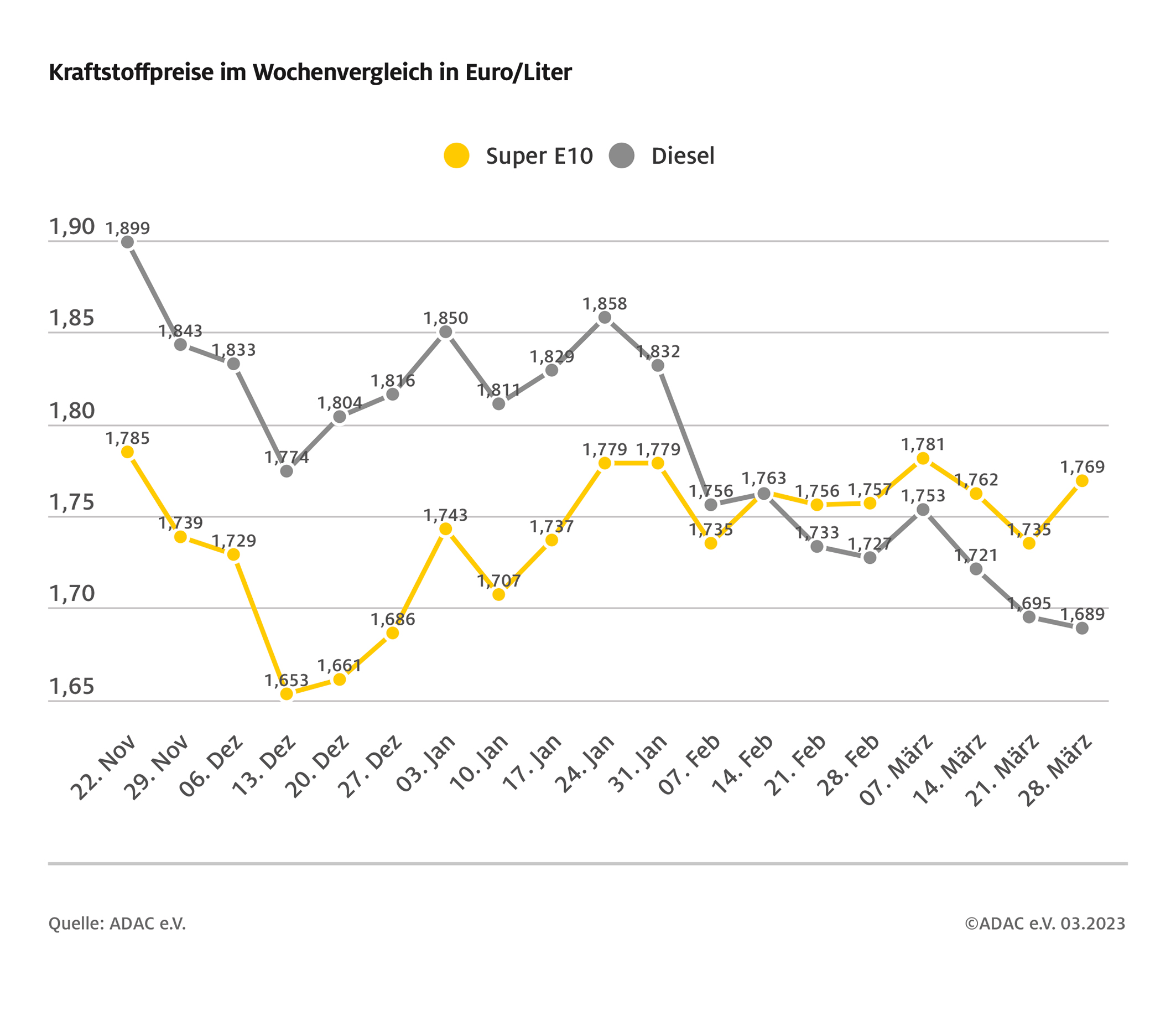 München (ots) – Die Preisdifferenz zwischen Super E10 und Diesel hat sich binnen Wochenfrist verdoppelt und beträgt mittlerweile acht Cent. Dies zeigt die aktuelle ADAC Auswertung der Kraftstoffpreise in Deutschland. Danach kostet ein Liter Super E10 im bundesweiten Mittel 1,769 Euro und damit 3,4 Cent mehr als in der Vorwoche. Diesel ist um 0,6 Cent billiger und kostet aktuell 1,689 Euro je Liter.