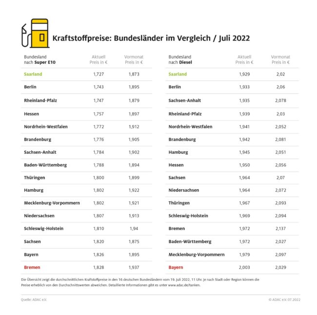 ADAC: Tanken in Bayern und Bremen am teuersten – Autofahrer im Saarland tanken am günstigsten – Preisdifferenzen von rund zehn Cent