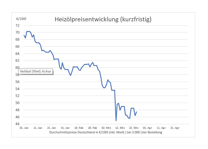 Seitdem bleiben die Heizölpreise zwar auf niedrigem Niveau, haben aber keine neuen Tiefsstände mehr erreicht. Der Durchschnittspreis am 9. März war bei 44,93 Euro gelegen. Von Dauer war dieser Tiefsstand allerdings nicht, denn schon am 10. März lag der durchschnittliche Preis wieder bei 49,63 Euro.