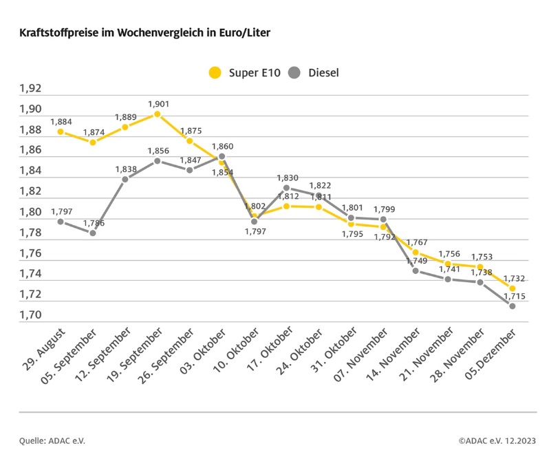 Der Preis für Rohöl sackt weiter ab – und die Spritpreise folgen ihm, wenngleich noch nicht in ausreichendem Umfang. Wie die aktuelle ADAC Auswertung der Kraftstoffpreise in Deutschland zeigt, ist der Preis für einen Liter Super E10 gegenüber der Vorwoche um 2,1 Cent auf aktuell 1,732 Euro gesunken. Um 2,3 Cent hat sich Diesel-Kraftstoff binnen Wochenfrist verbilligt und kostet jetzt im bundesweiten Mittel 1,715 Euro. Damit ist Diesel so günstig wie zuletzt Ende Juli, Benzin ist auf dem niedrigsten Stand seit Mitte Januar.
