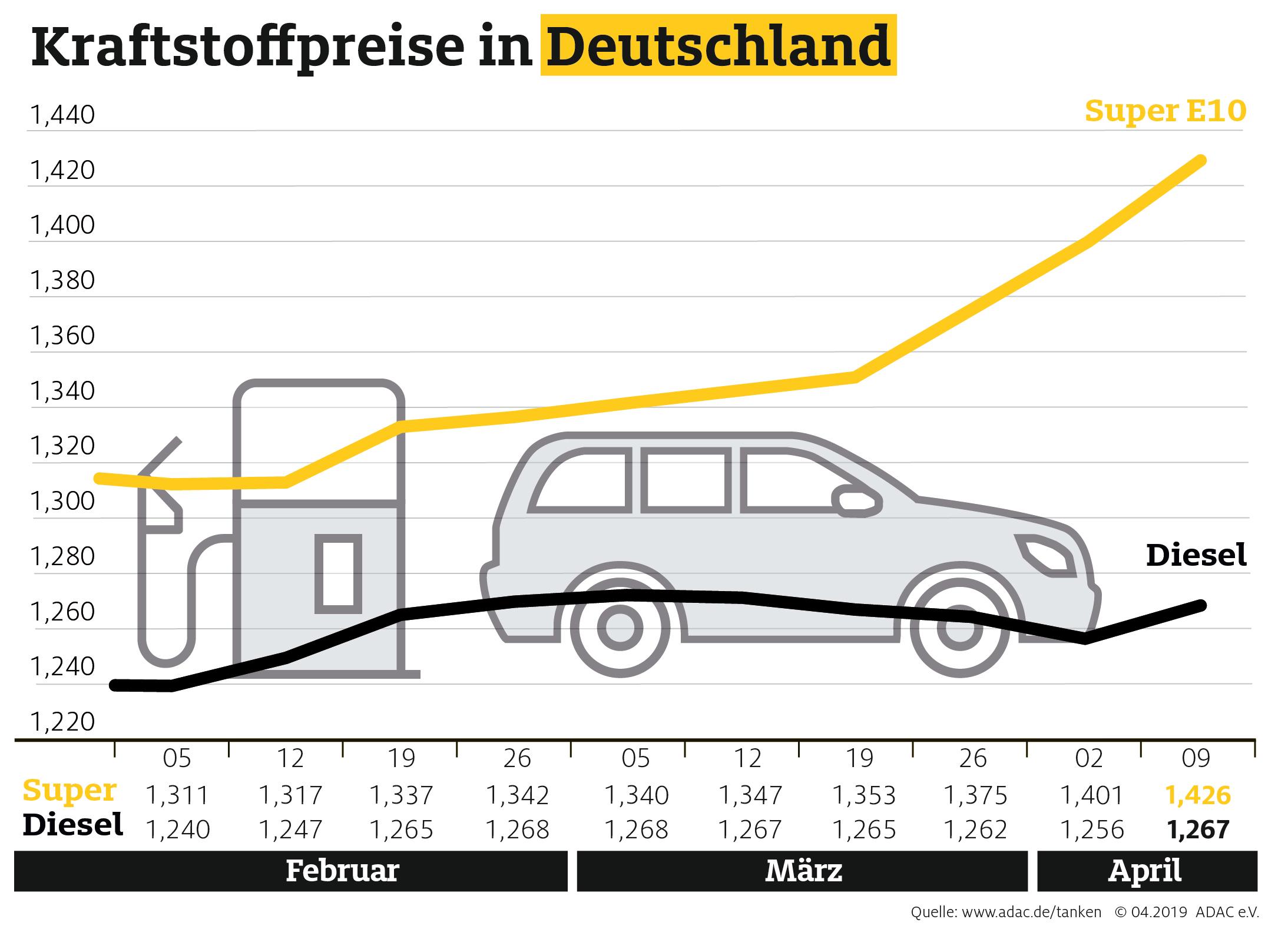 Autofahrer müssen an den Tankstellen wieder deutlich tiefer in die Tasche greifen. Laut aktueller Auswertung des ADAC kostet ein Liter Super E10 im Bundesdurchschnitt 1,426 Euro und damit 2,5 Cent mehr als in der Vorwoche. Auch Diesel wurde teurer, wenn auch weniger stark als Benzin. Für einen Liter muss man im Mittel 1,267 Euro bezahlen, ein Anstieg von 1,1 Cent. Die Preisdifferenz zwischen beiden Sorten vergrößerte sich dadurch weiter auf nun 15,9 Cent je Liter. Dies ist der höchste wöchentliche Durchschnittswert seit mehr als sechs Monaten.
