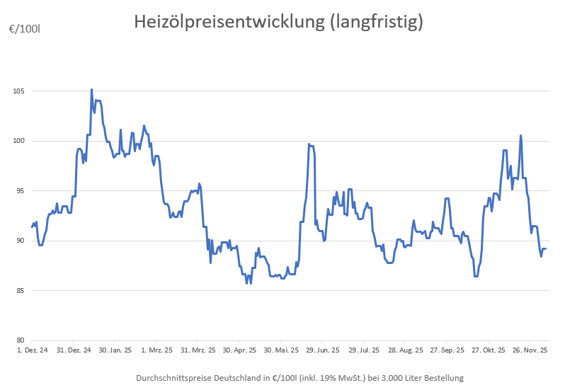 Die genannten Heizölpreise beziehen sich stets auf den deutschlandweiten Durchschnittspreis bei einer Bestellung von 3.000 Liter Heizöl Standard schwefelarm inklusive 19 % MwSt. Außerdem fallen die Preise aufgrund der Transportkosten regional unterschiedlich aus. Stand der Preise 05.12.2025