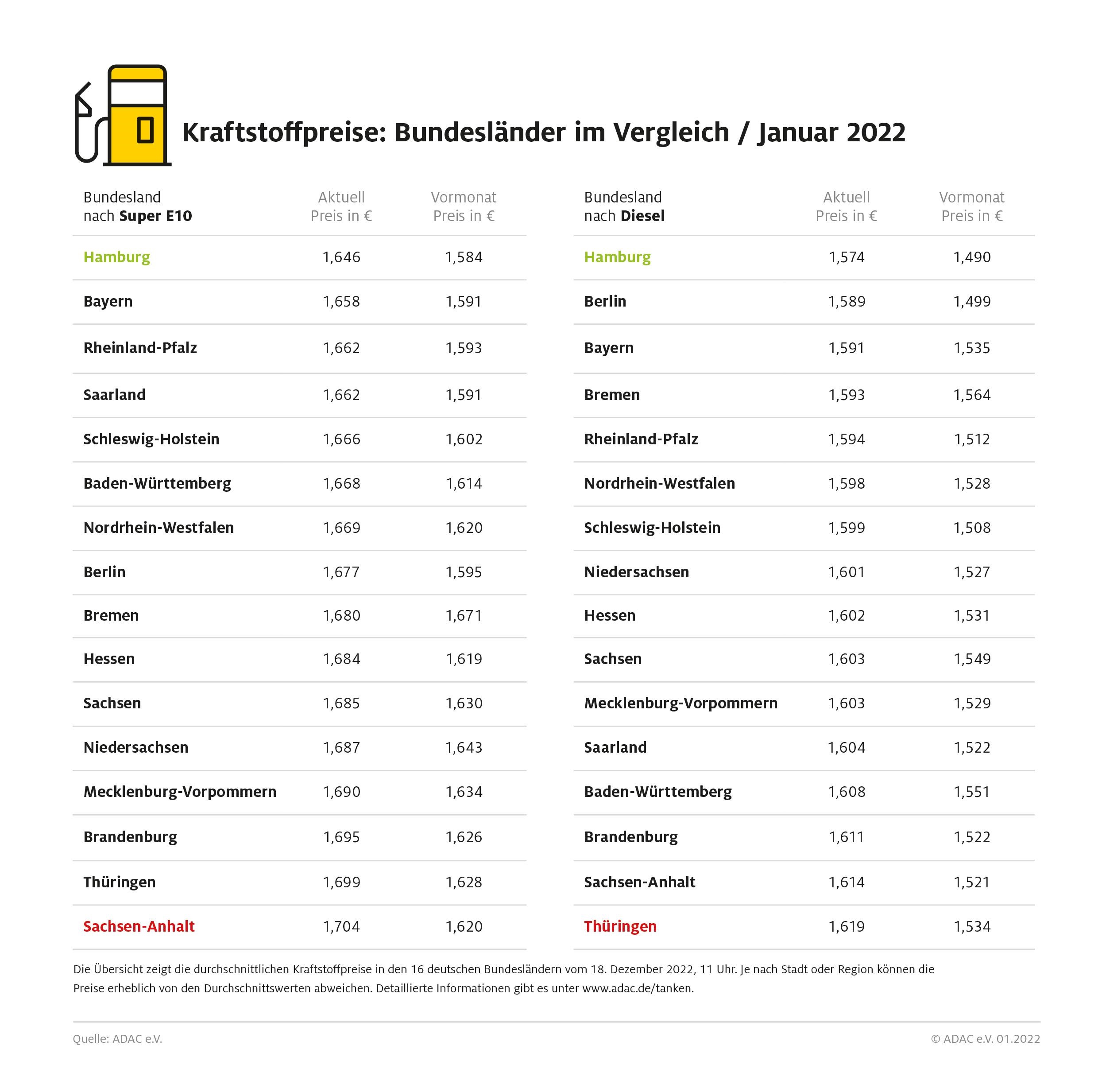 Vergleichsweise günstig fallen die Tankrechnungen laut ADAC in Hamburg aus. Für einen Liter Super E10 zahlt man in der Hansestadt 1,646 Euro und damit immerhin 5,8 Cent weniger als in Sachsen-Anhalt. Auch für Diesel müssen die Hamburger bundesweit am wenigsten bezahlen: Ein Liter schlägt in Hamburg mit 1,574 Euro zu Buche – das sind 4,5 Cent weniger als in Thüringen.